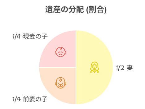 たとえば、現妻と前妻の子が一人ずついる場合、妻が1/2、残りの1/2をふたりで分けるので、それぞれ1/4ずつ相続します。