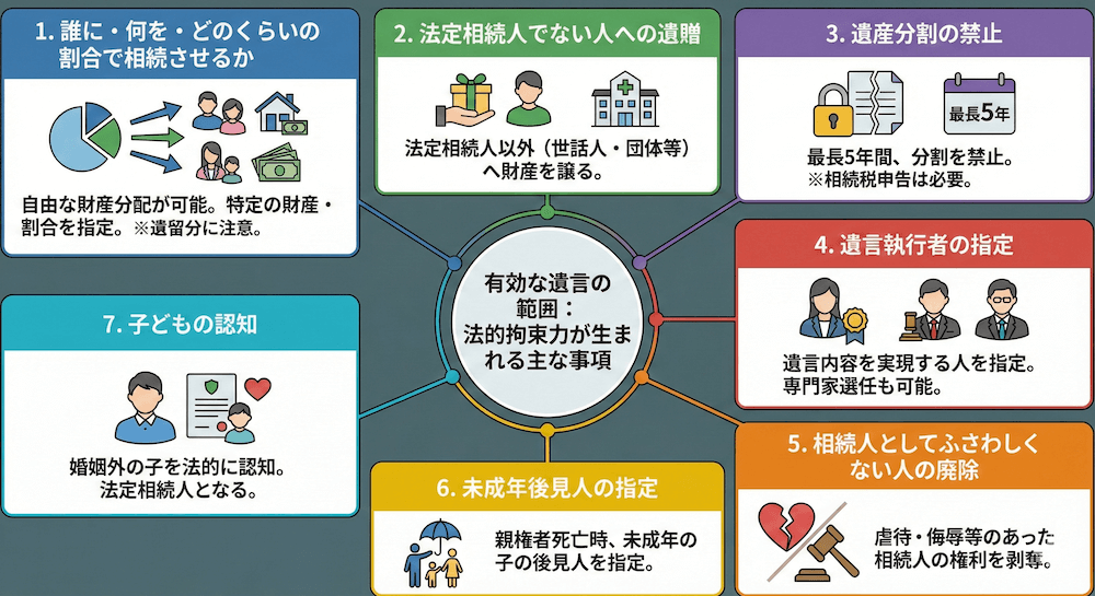 遺言書に記載することで法的拘束力が生まれる主な事項を紹介します。相続や遺贈に関すること、相続人の資格に関すること、身分に関すること、遺言の執行や管理に関することなどがあります。