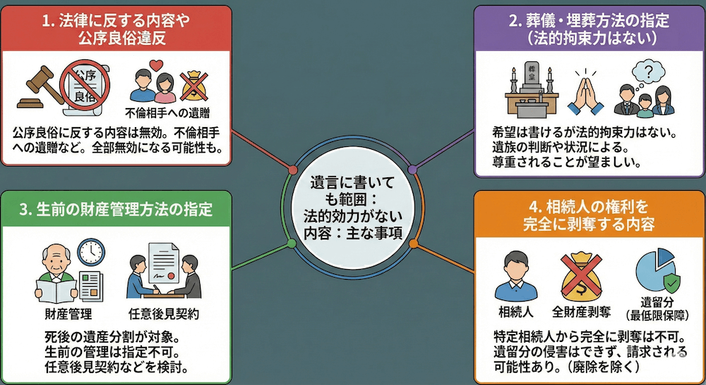 遺言書を作成する際には、法律で認められた範囲内で、遺言者の意思を具体的に示すことが重要です。「法律で認められた範囲内で」というのがポイントで、遺言書に記載したからといって全ての内容が法的拘束力をもつわけではありません。