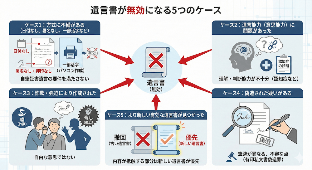 遺言書は、遺言者の最終的な意思表示として尊重されるべきものですが、法律で定められた要件を満たしていない場合や、遺言者の意思能力に問題があった場合などには無効となることがあります。ここでは、遺言書が無効になる5つのケースについて詳しく解説します。